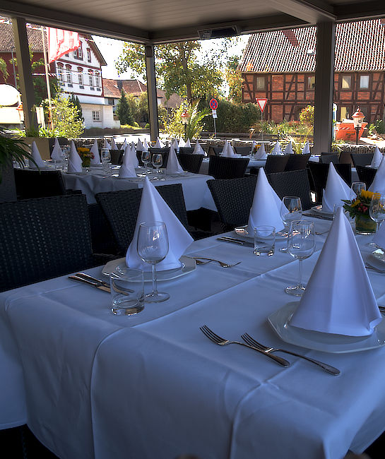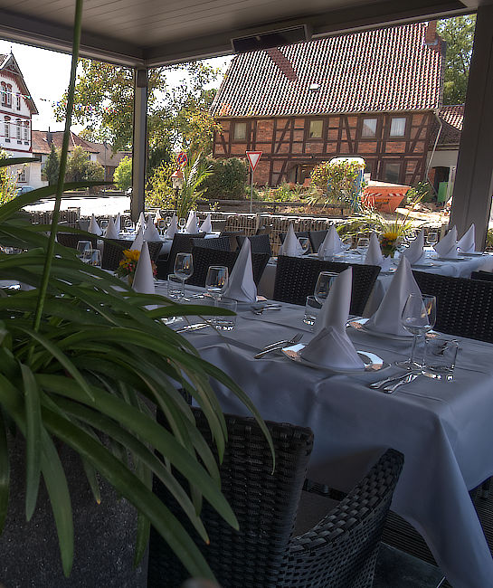 Bekannt über die Ortsgrenzen hinaus, bietet die Terrasse Platz für 50 Gäste in einer geselligen Atmosphäre. Genießen Sie hier kalte Getränke und köstliche Speisen bei schönem Wetter im freien.
